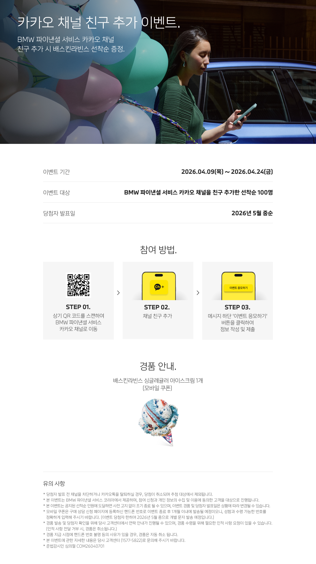 BMW 파이낸셜 서비스 카카오 채널 친구 추가 시 배스킨라빈스 선착순 증정.